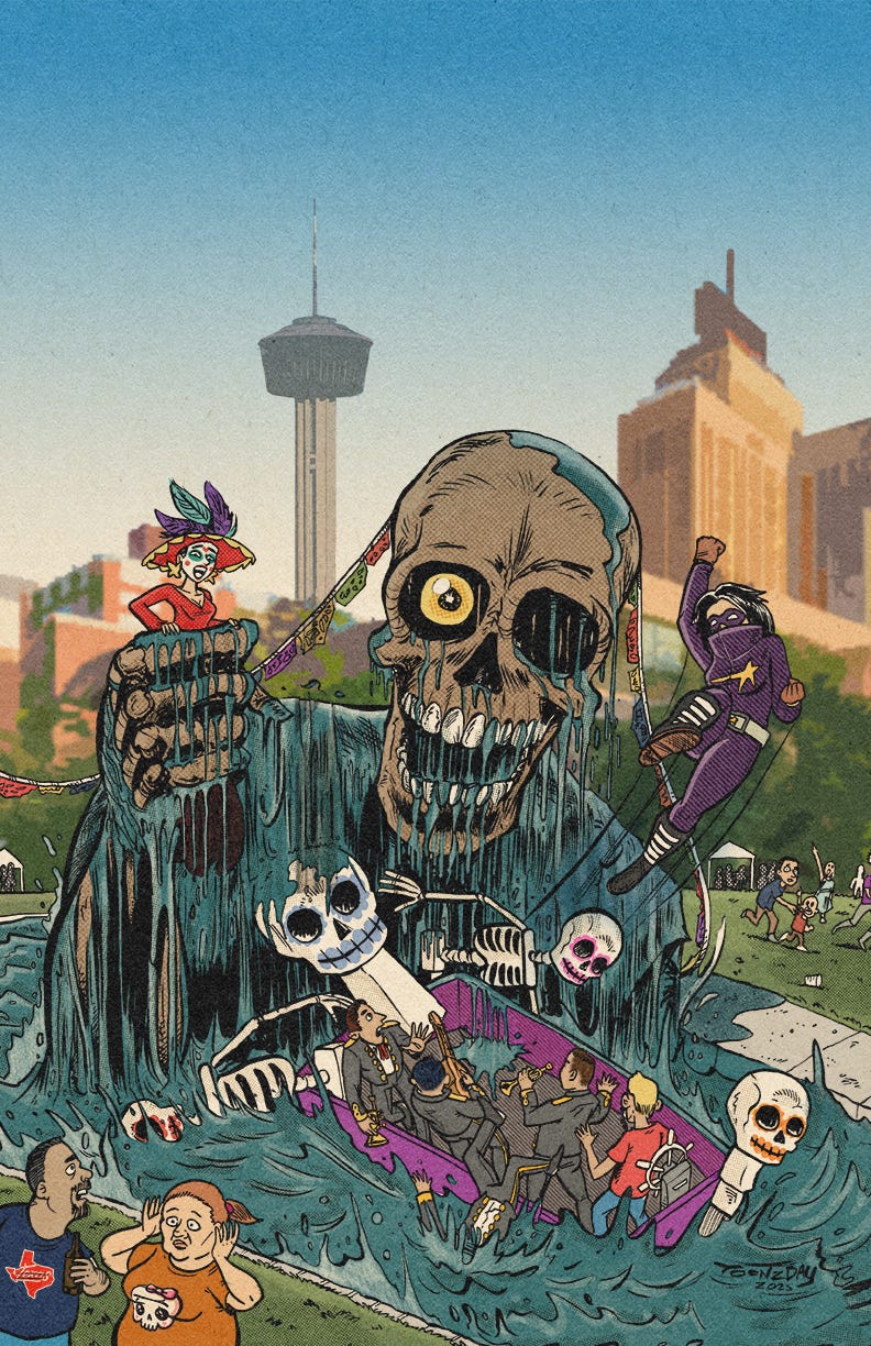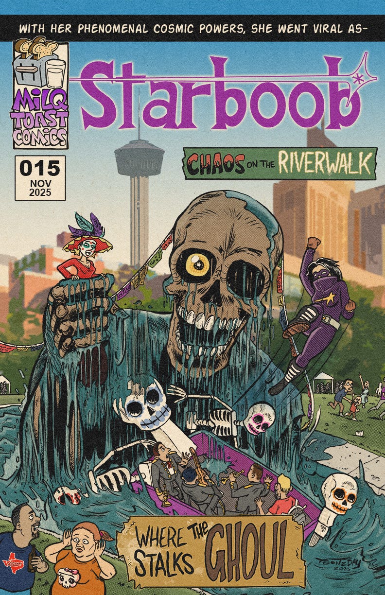 Last weekend my wife and I embarked to San Antonio for Muertos Fest, a weekend-long celebration of Dia de los Muertos, in downtown San Antonio. We even booked some seats for the boat parade on the Riverwalk which was really something. And naturally, inspiration struck, so I made this mock cover featuring Starboob.