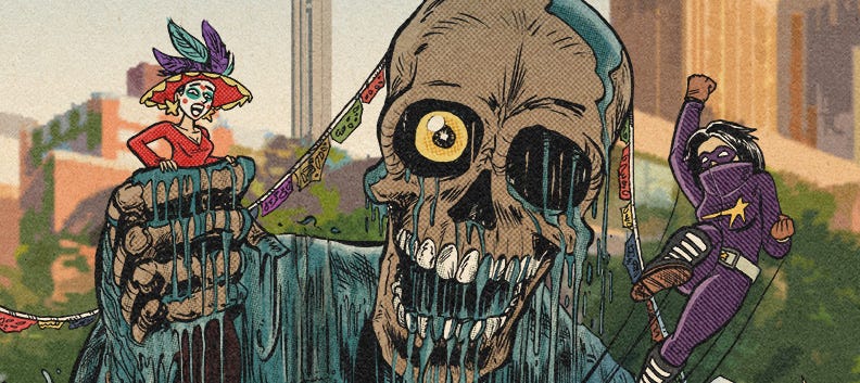 Much like many comic artists and writers of yore, I was immersed in a cultural gathering of people surrounded by colorful sights, delicious smells, and rhythmic infectious sounds, and then I imagined what if a giant monster emerged? And who do I have to save the day?