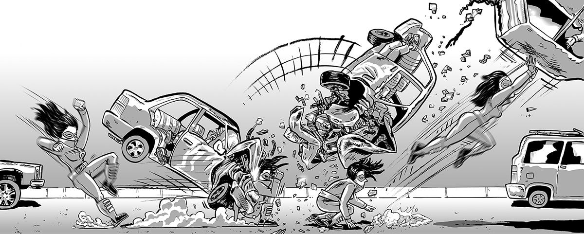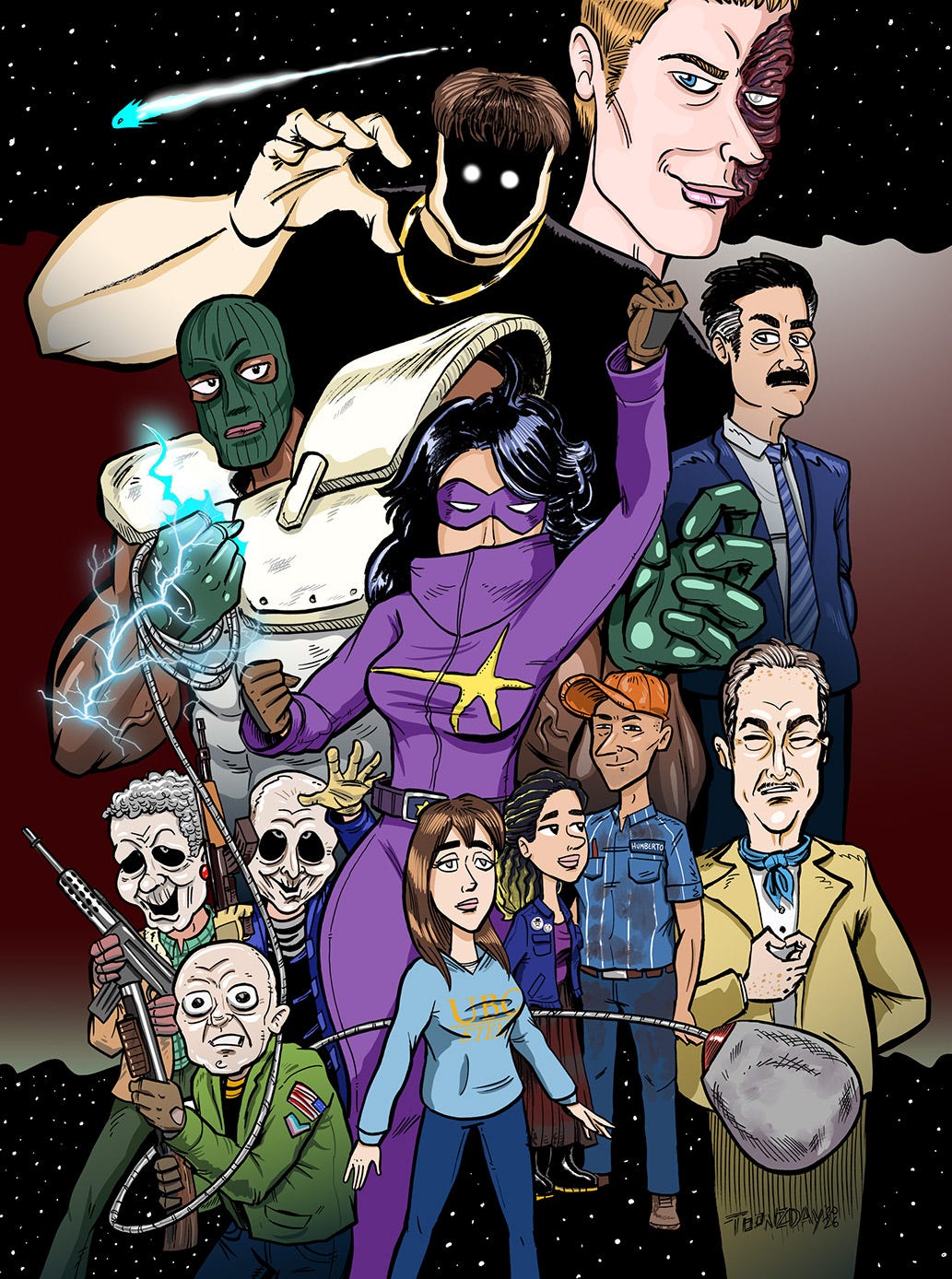 I’ve written all kinds of comic stories. Stoner stories (Screw Comics 1), Horror & Political action thrillers (Screw Comics 2), about graffiti artists & alien encounters (Chingazo zines), time travelling and parallel universe travels (Screw Comics 3 & 4), retelling of classic fables (Screw Comics 4), so never would I have imagined that I would be immersed in a superhero universe, cranking out chapter after chapter of masked character action. I guess I have a lot to say using this story framework. Indeed, I’ve written the first 12 issues (chapters), they poured outta me when it was time to sit down and write.